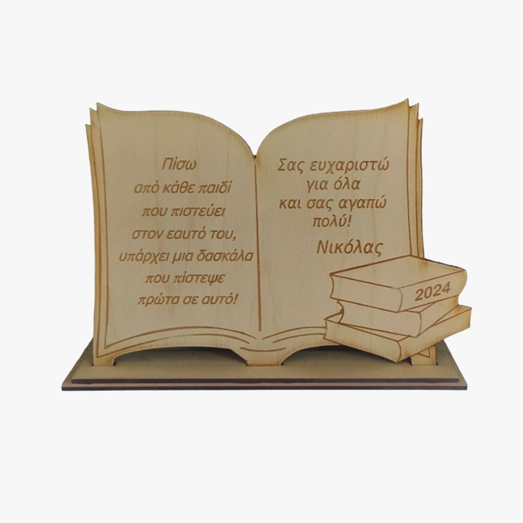 Ξύλινο αναμνηστικό δώρο βιβλίο για Δάσκαλο ή Δασκάλα με προσωποποιημένη αφιέρωση. Διαστάσεις 24*35 εκ.