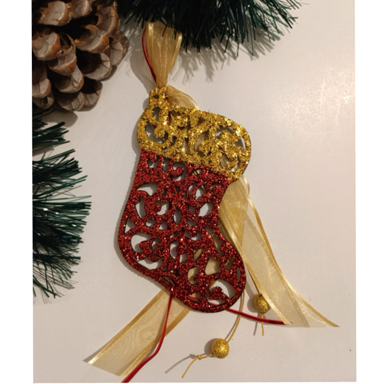 Διακοσμητικό, κρεμαστό Χριστουγεννιάτικο στολίδι, διακοσμημένο με γκλίτερ σε χρώμα χρυσό και κόκκινο, διαστάσεων 10*14εκ. ή κατά παραγγελία